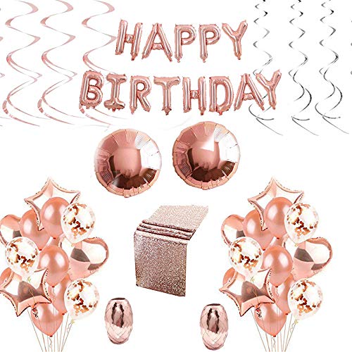 - SET INCLUDE:Rose &Gold Happy Birthday Party Supplies Decorations Set include 30PCS 12" latex balloons (20pcs rose gold ,10pcs clear color with rose gold confetti),12pcs swirls(6pcs sliver ,6pcs rose gold ),1pcs rose gold sequin table cloth ,1pcs happy birthday foil banner ,2pcs rose gold ribbon ,8pcs 18 inches foil balloons (4pcs star ,2pcs heart,2pcs round Mylar balloons )